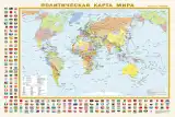 Двухсторонняя покрытая полимерной плёнкой карта имеет размеры 870 мм х 580 мм. На одной её стороне - Политическая карта мира в масштабе 1:44 000 000 (в 1 см 440 км), на другой – карта «Федеративное устройство России» масштаба 1:12 000 000 (в 1 см 120 км). На Политической карте представлены все 196 независимых государств мира с их столицами, а также владения и территории с особым статусом. Населённые пункты на карте даны в трёх градациях численности: более 1 млн жителей, от 100 тыс. до 1 млн, менее 100 тыс. жителей. Карта обрамлена официальными флагами государств мира, расположенными в алфавитном порядке, что облегчает их поиск. На карте "Федеративное устройство России" представлены все 85 субъектов Федерации, включая Республику Крым и Севастополь, с их столицами и центрами.