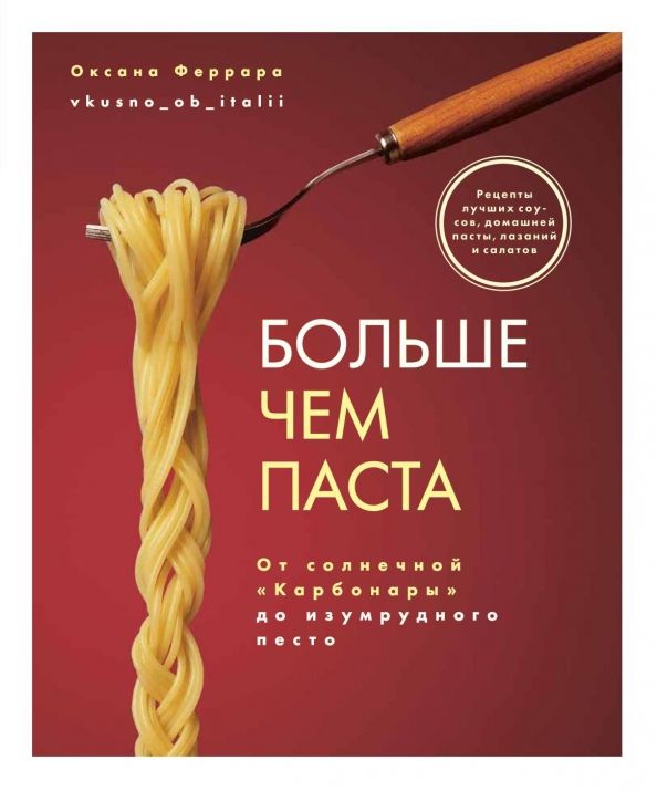 Ароматная, тёплая, сытная, любимая – паста и блюда из неё могут быть разными, но всегда будут вкусными. Популярный блогер Оксана Феррара (@vkusno_ob_italii) признаётся в любви к пасте: каждый её рецепт пропитан южным солнцем и ароматом пряных трав. При этом никаких сложностей и никаких экзотических ингредиентов! Вы узнаете секреты итальянской диеты, научитесь правильно использовать оливковое масло, без труда приготовите идеальный томатный соус и сразу несколько вариантов песто. Знакомьтесь с классикой: очаровательными тортеллини, кроликом по-икситански, лучшей «Карбонарой» и аппетитным мясным рагу. Готовьте лёгкие и питательные салаты, добавьте в пасту тыкву, морковный крем и даже картофель! Подайте к обеду равиоли со шпинатом, розовые спагетти, румяное пастиччо, блинную лазанью с грибами или маккерони с сочными фрикадельками.