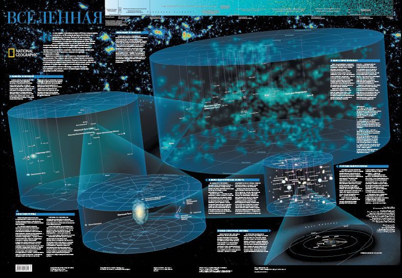 Уникальная возможность увидеть и осознать наше место в бесконечном Космосе! На плакате с помощью 5 схем - "пяти скачков масштаба" - наглядно представлено положение Земли и Солнечной системы во Вселенной. На линейной шкале показаны основные этапы формирования Вселенной от Большого взрыва до нашего времени. Краткие и содержательные тексты дополняют и поясняют содержание схем. Плакат становится особенно актуальным в свете грядущего возвращения астрономии в школьные программы.