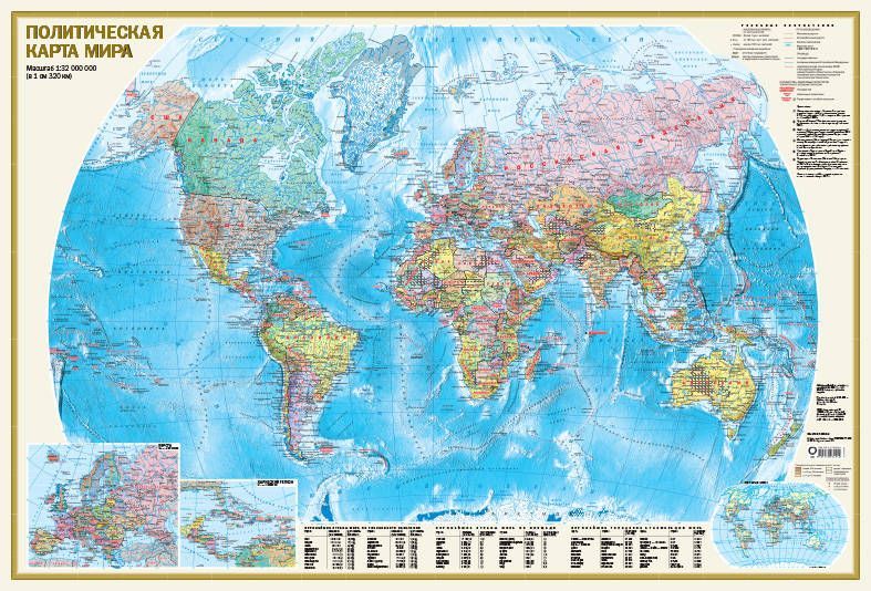 На Политической карте масштаба 1:32 000 000 (в 1 см 320 км) представлены все независимые государства мира, а также владения и территории с особым статусом. Хорошо различимыми пунсонами показаны населённые пункты с градациями «более 1 млн жителей», «от 100 тыс. до 1 млн жителей» и «менее 100 тыс. жителей». Отражены основные железнодорожные и автомобильные пути сообщения. Морские пути даны с указанием километража. Главную карту дополняют врезки в более крупных масштабах на Европу и Карибский регион, а также карта «Плотность населения». В табличном виде приведены данные о крупнейших странах мира по населению, площади, а также об основных городских агломерациях мира. Размеры карты 1170х790 мм. Политическая карта мира упакована в прозрачный тубус (пакет с объёмным дном и еврослотом) из мягкого пластика. Размеры тубуса: длина 800 мм, диаметр 50 мм.