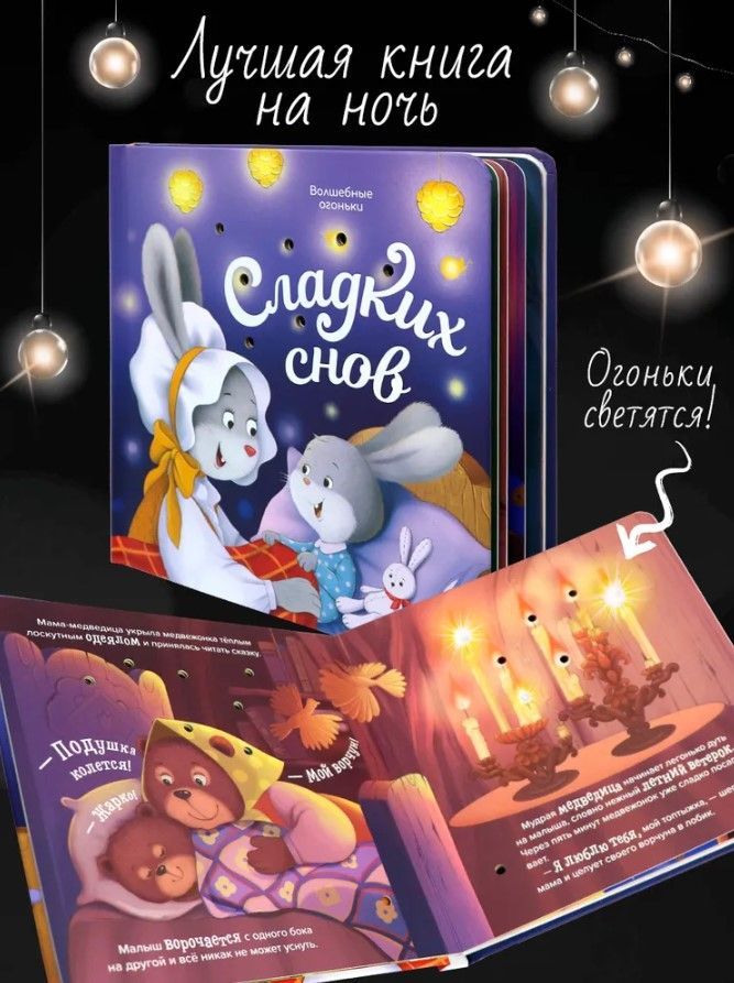 «Волшебные огоньки» — новая серия от торговой марки Malamalama! Самая уютная книга на свете — «Спокойной ночи» — расскажет малышу, как лесные мамы укладывают спать своих малышей-зверят. Милые иллюстрации, добрые персонажи и самые настоящие огоньки на страницах ждут ребёнка в книге. Звёздочки в небе, свечи в комнате, светлячки или фонарики — внутри каждой страницы располагаются светодиоды, которые выглядывают в крошечные отверстия, заставляя их на самом деле светиться. Отройте для себя настоящее волшебство вместе с Malamalama!
