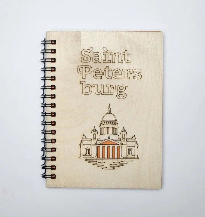 Блокнот из серии «Санкт-Петербург» формата А6 с 50 нелинованными листами, обложка выполнена из берёзовой фанеры, производство — 100% Российская Федерация.