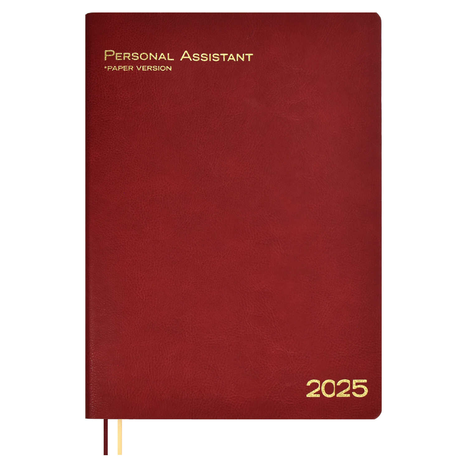Ежедневник датированный 2025 ESCALADA, А4, 120 л., арт. 66938/ 10 ШЕВРЕТ ГЛОСС БОРДОВЫЙ (кожзам: 210х297 мм, мягкий переплёт, запаянный край, материал обложки: искусственная кожа "Шеврет глосс"; декор: тиснение фольгой; способ крепления блока: ниткошвейный; вн. блок: 120 л., белый офсет 80 г/м², печать в две краски (линия), справочный материал: есть; перфорация углов блока: нет; закладка/-и: два ляссе; каптал: есть; форзац: печать пантоном; особенности: 1 лист с наклейками в комплекте; персонализация возможна: да; индивидуальная упаковка: промостикер + ПЭТ-пакет)