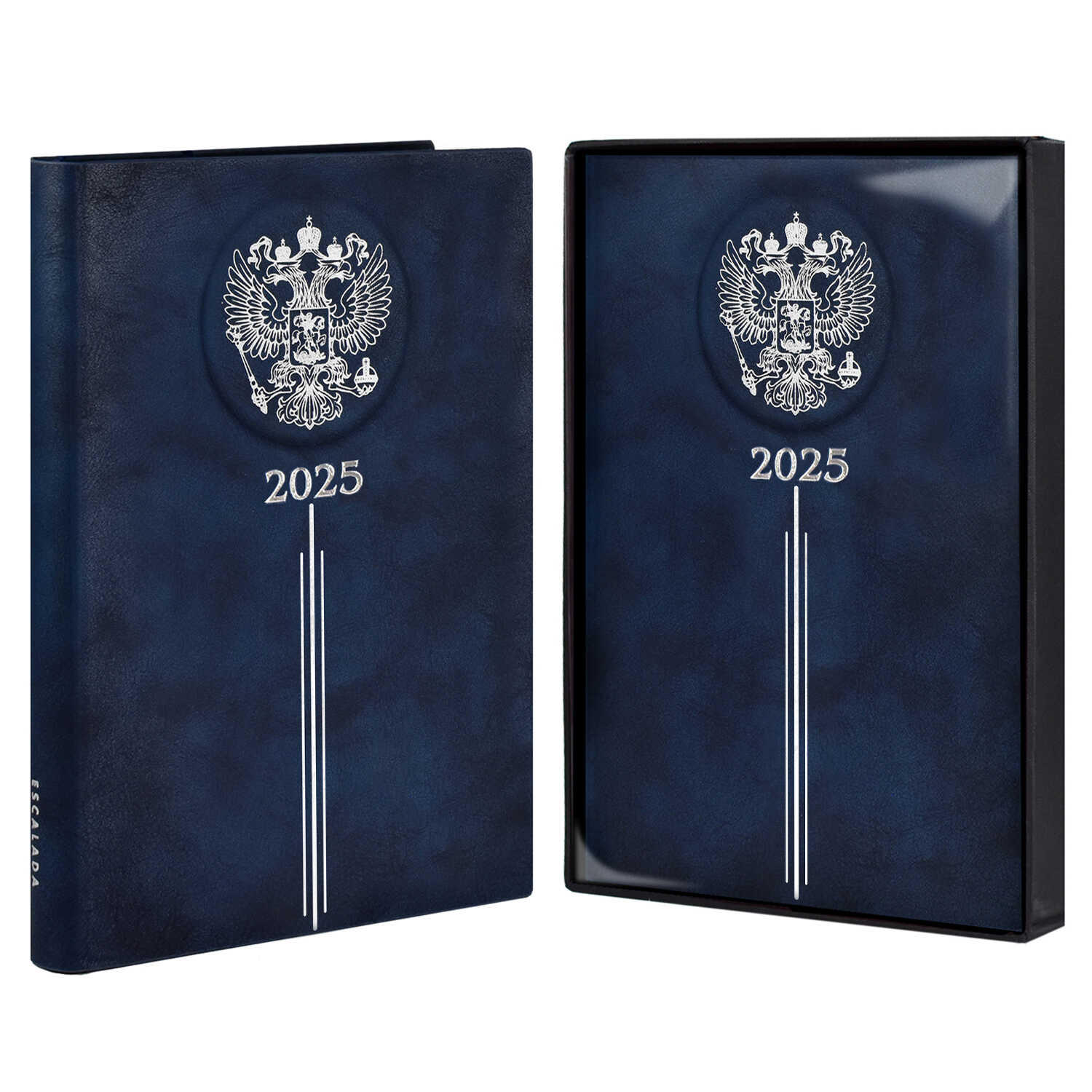 Ежедневник датированный 2025 ESCALADA, А5, 176 л., арт. 66990/ 10 ТИВОЛИ СИНИЙ (кожзам: 146x211 мм, твёрдый переплёт, запаянный край, материал обложки: искусственная кожа "Тиволи"; декор: 3D-дизайн, тиснение фольгой; способ крепления блока: ниткошвейный; вн. блок: 176 л., кремовый офсет 70 г/м², печать в две краски (линия), справочный материал: есть; перфорация углов блока: нет; отделка среза: фольгирование; закладка/-и: два ляссе; каптал: есть; форзац: печать пантоном; персонализация возможна: да; индивидуальная упаковка: промостикер + подарочная картонная коробка с ПВХ-крышкой + ПЭТ-пакет)