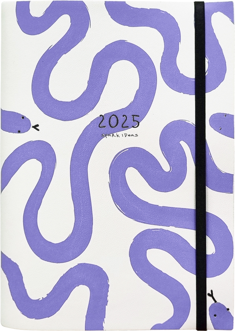 Обложка - мягкая с резинкой, фактурная глянцевая искусственная кожа с печатью шелкографией, цвет - сиреневый. Блок - датированный, 352 стр., прямые уголки, кармашек, 2 ляссе, бумага: слоновая кость, прямые уголки, 70 г/м2, печать 1+1. Особенности: тиснение черной фольгой, черный прокрас обреза блока.