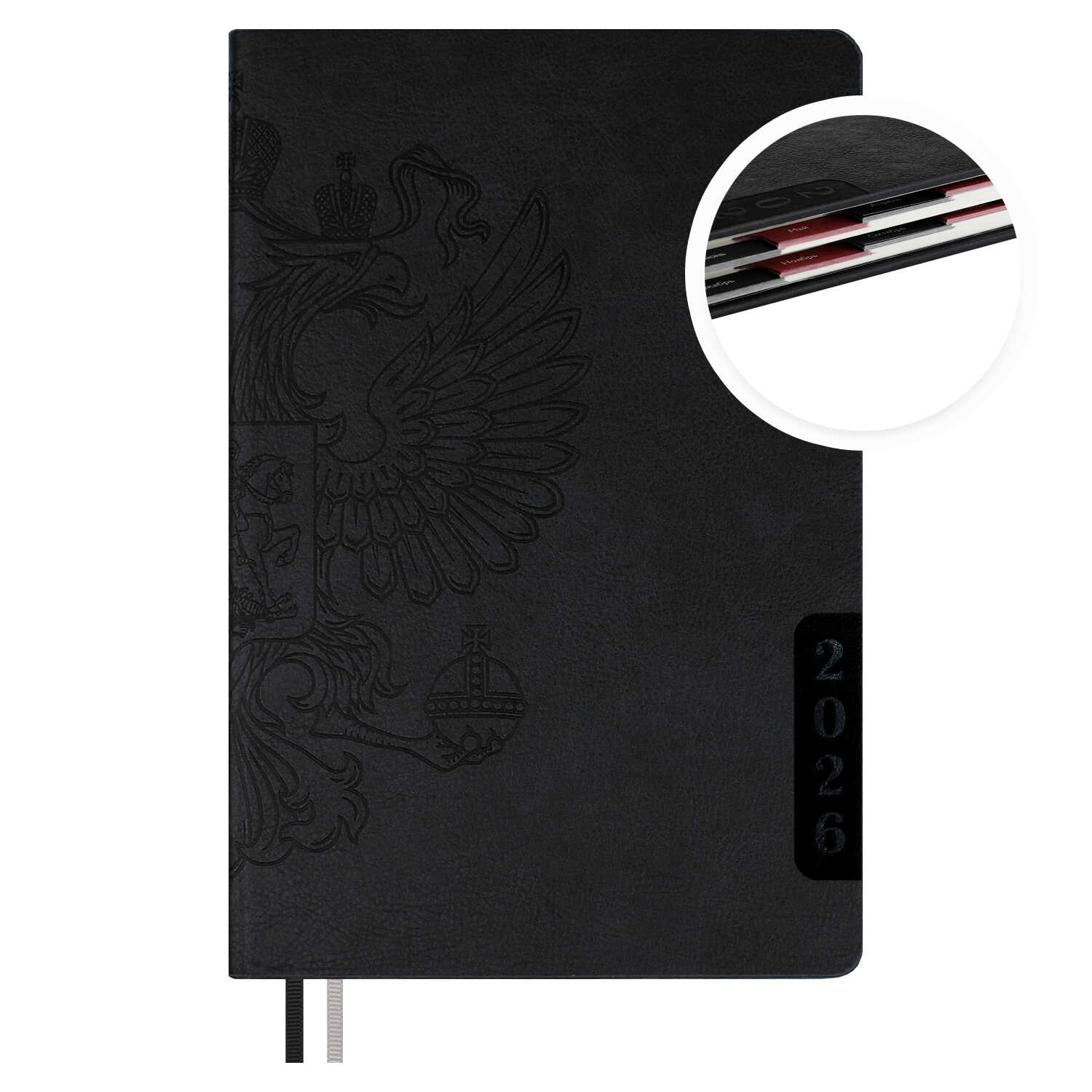 - Ежедневник 2026 А5; 176л. Герб арт. 70245; Черный, Феникс+; вырубка блока по месяцам, тиснение блинт