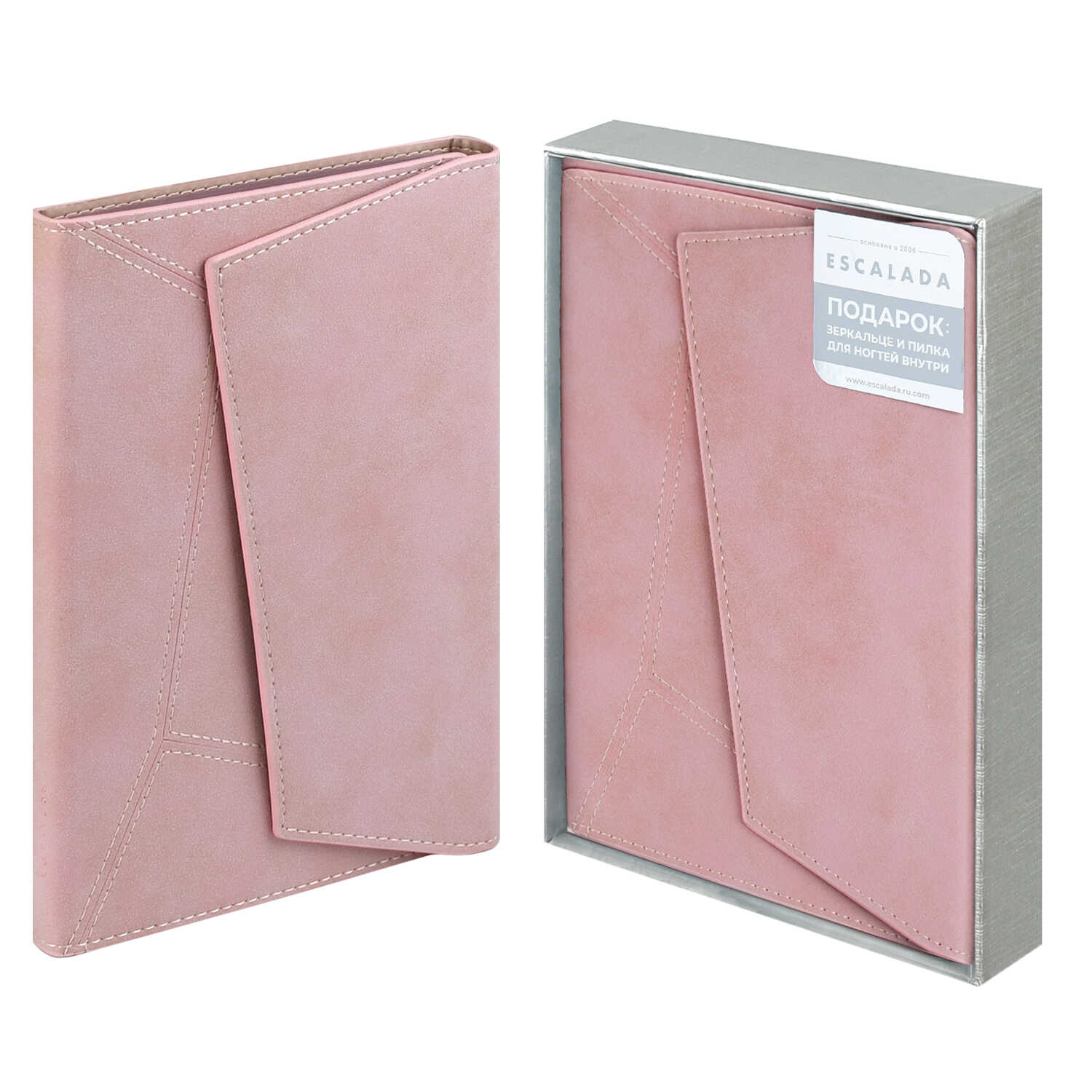 Ежедневник недатированный ESCALADA, А5, 120 л., арт. 70605/ 15 СПИЛОК ДЕЛАВЭ РОЗОВЫЙ (кожзам: 146x211 мм, твёрдый переплёт, запаянный край, материал обложки: искусственная кожа "Спилок делавэ"; способ крепления блока: ниткошвейный; вн. блок: 120 л., серый офсет 70 г/м², печать в одну краску (линия), справочный материал: есть; перфорация углов блока: нет; отделка среза: окрашивание пантоном; закладка/-и: одно ляссе, каптал: есть; форзац: печать пантоном, особенности: зеркальце и пилка для ногтей с оборотной стороны магнитного клапана, комбинированные материалы, магнитный клапан, петля для ручки; персонализация возможна: да; индивидуальная упаковка: промостикер + подарочная картонная коробка с ПВХ-крышкой + ПЭТ-пакет)