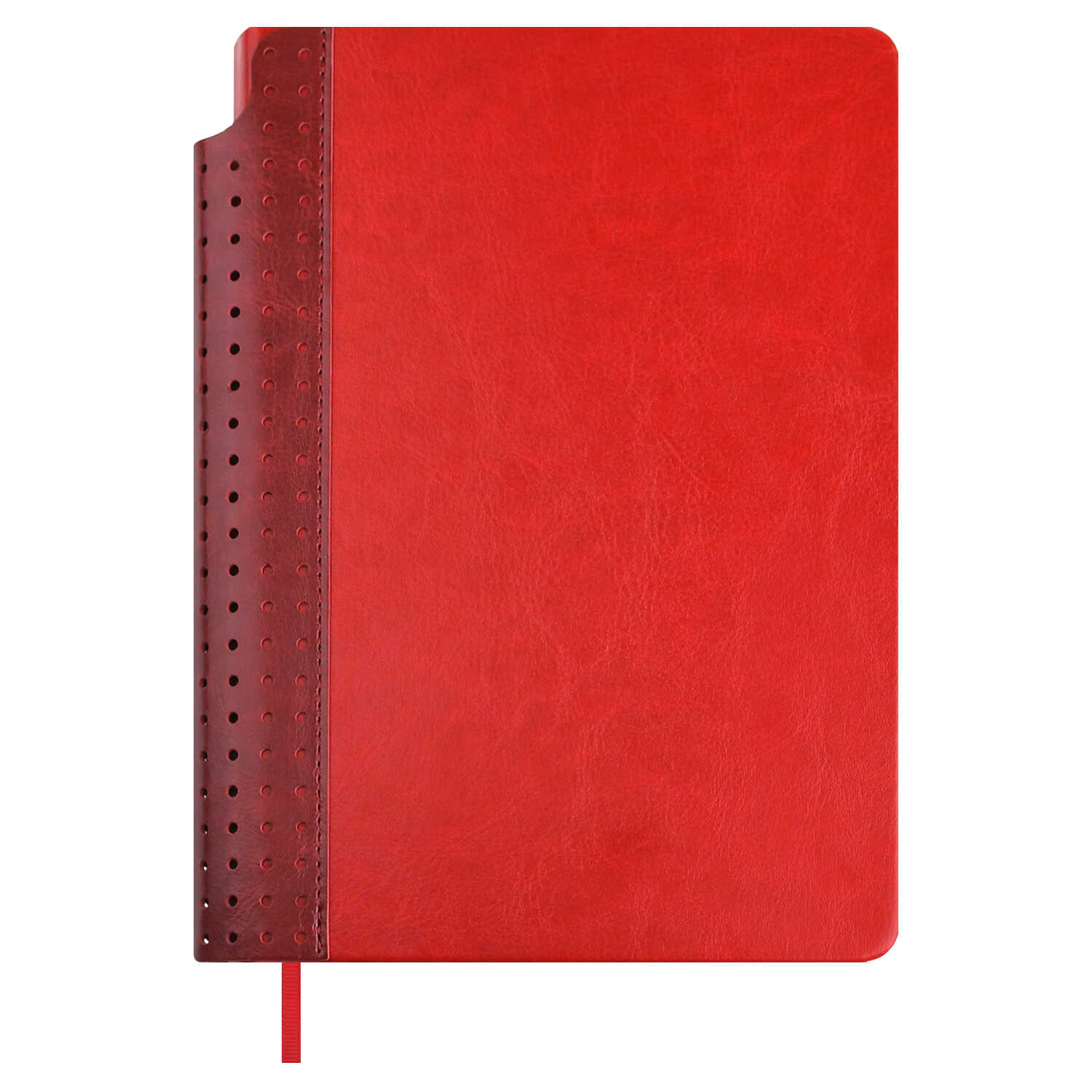 Ежедневник недатированный ESCALADA, А5, 160 л., арт. 70620/ 15 САРИФ КРАСНЫЙ (кожзам: 156x211 мм, твёрдый переплёт, материал обложки: искусственная кожа "Сариф"; способ крепления блока: ниткошвейный; декор: перфорация; вн. блок: 160 л., кремовый офсет 70 г/м², печать в одну краску (линия), справочный материал: есть; перфорация углов блока: нет; отделка среза: окрашивание пантоном; закладка/-и: одно ляссе, каптал: есть; форзац: печать пантоном, особенности: место для хранения ручки в корешке; персонализация возможна: да; индивидуальная упаковка: ПЭТ-пакет)