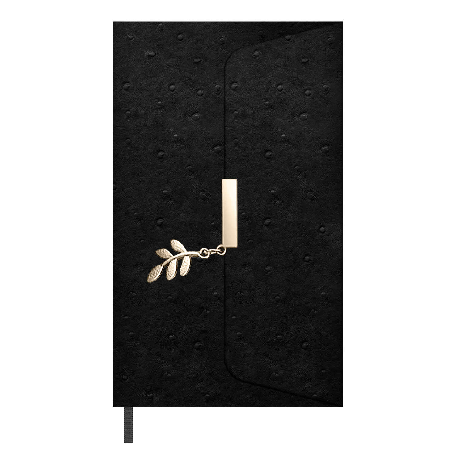 Ежедневник недатированный ESCALADA, А5, 160 л., арт. 70668/ 15 СТРАУС ЧЁРНЫЙ (кожзам: 126х211 мм, твёрдый переплёт, материал обложки: искусственная кожа "Страус"; способ крепления блока: ниткошвейный; декор: металлический шильд с декоративной металлической фигуркой; вн. блок: 160 л., кремовый офсет 70 г/м², печать в одну краску (линия), справочный материал: есть; перфорация углов блока: нет; отделка среза: окрашивание пантоном; закладка/-и: одно ляссе, каптал: есть; форзац: печать пантоном, тиснение фольгой, особенности: карман-уголок внутренний, магнитный клапан; персонализация возможна: да; индивидуальная упаковка: ПЭТ-пакет)