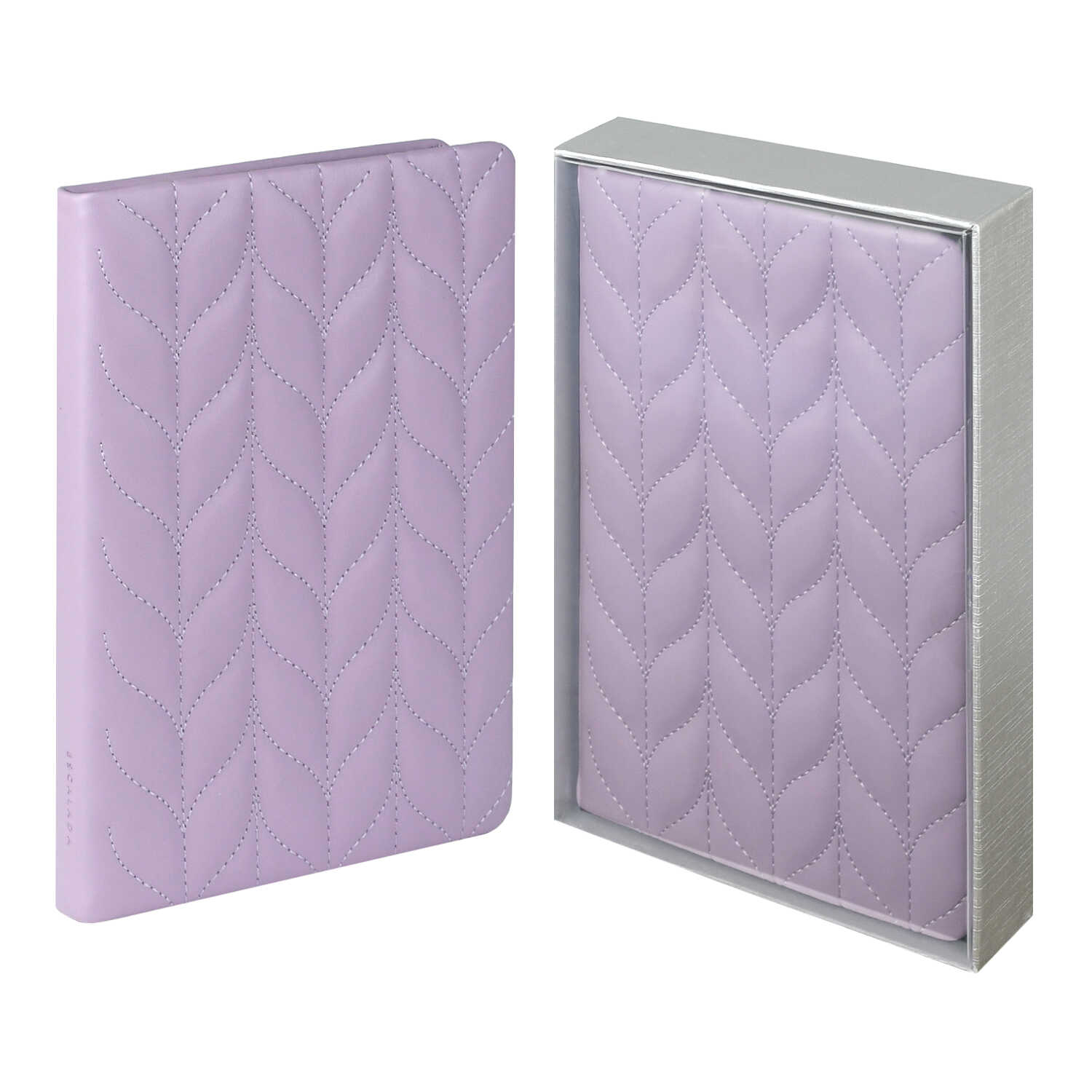 Ежедневник недатированный ESCALADA, #ОТ-КУТЮР, А5, 164 л., арт. 70593/ 15 ЛАЙКА МЕТАЛЛИК СИРЕНЕВЫЙ (кожзам: 146х211 мм, твёрдый переплёт с поролоном, материал обложки: искусственная кожа "Лайка металлик"; способ крепления блока: ниткошвейный; декор: стёганая строчка; вн. блок: 164 л., кремовый офсет 70 г/м², печать в одну краску (линия), справочный материал: есть; перфорация углов блока: нет; закладка/-и: одно ляссе, каптал: есть; форзац: печать пантоном, особенности: 4 листа иллюстраций с высказываниями на полупрозрачной кальке; персонализация возможна: нет; индивидуальная упаковка: промостикер + подарочная картонная коробка с ПВХ-крышкой + ПЭТ-пакет)