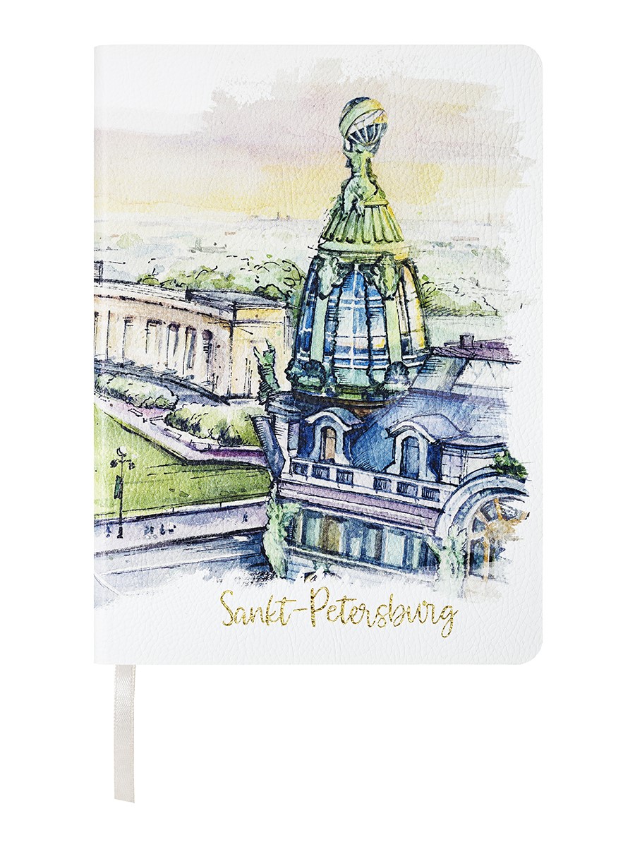 Ежедневник недатированный формат А5, 168 листов, гибкая обложка из экокожи , цветная УФ печать по белой фактурной экокоже, тиснение золотой фольгой, скруглённые углы блока и обложки, золочение среза (фольгирование золотой фольгой), ляссе слоновая кость, индивидуальная упаковка