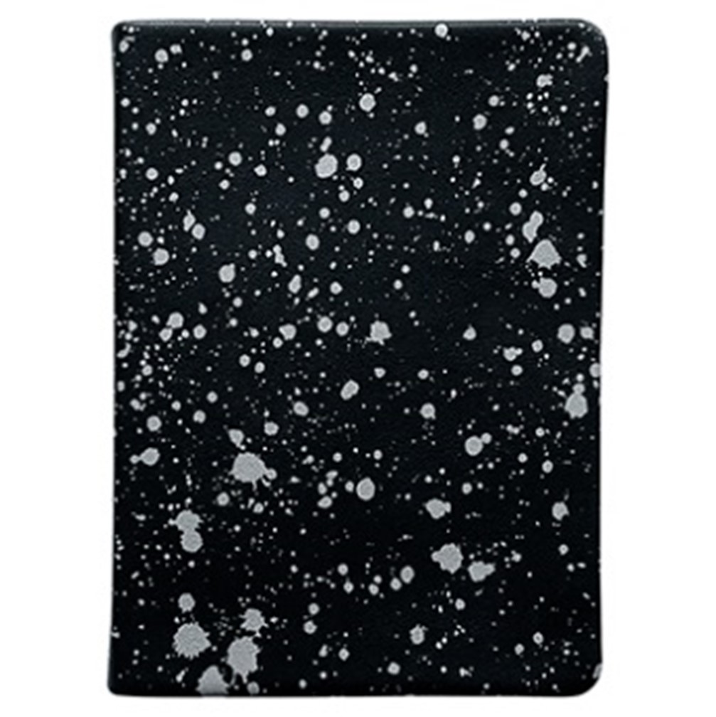 Обложка - интегральная, фактурная искусcтвенная кожа, цвет - черный. Блок недатированный, 192 стр, скругленные уголки, 2 ляссе, информационный блок, бумага: цвет - слоновая кость, 70 г/м2, печать 2+2. Особенности: печать серебристой шелкографией принта "Пятнышки".