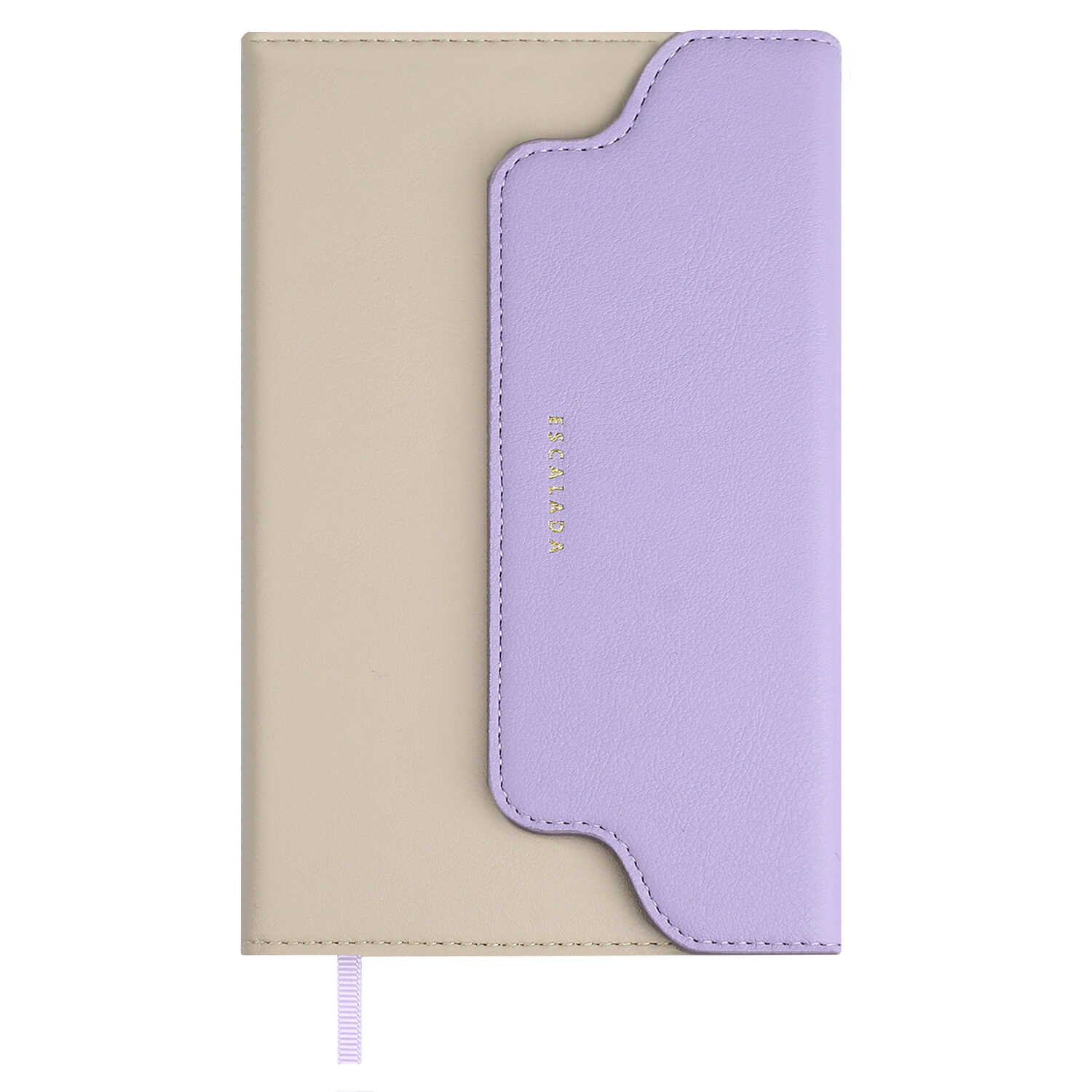 Ежедневник недатированный ESCALADA, А6+, 120 л., арт. 70675/ 20 ПЛЕЗИР БЕЖЕВЫЙ/СИРЕНЕВЫЙ (кожзам: 110x190 мм, твёрдый переплёт, запаянный край, материал обложки: искусственная кожа "Плезир"; способ крепления блока: ниткошвейный; декор: тиснение фольгой; вн. блок: 120 л., кремовый офсет 70 г/м², печать в одну краску (линия), справочный материал: есть; перфорация углов блока: нет; отделка среза: окрашивание пантоном; закладка/-и: одно ляссе, каптал: есть; форзац: печать пантоном, тиснение фольгой, особенности: комбинированные материалы, магнитный клапан; персонализация возможна: да; индивидуальная упаковка: ПЭТ-пакет)