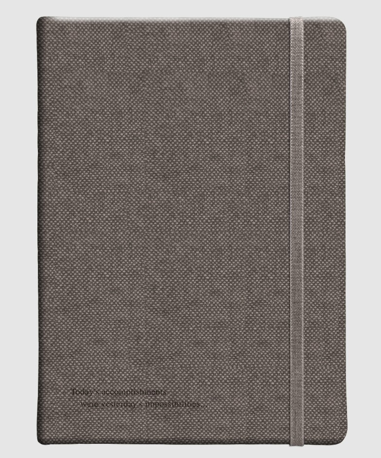 Обложка - твердая с резинкой, из преплетного материала с фактурой меланжевой рогожки, цвет - серый. Блок - недатированный, 192 стр., скругленные уголки, кармашек, 2 ляссе, бумага: слоновая кость, скругленные уголки, 70 г/м2, печать 2+2. Особенности: 2 ляссе и резинка в цвет основного материала, блинтовое тиснение, прокрас блока в цвет основного материала.