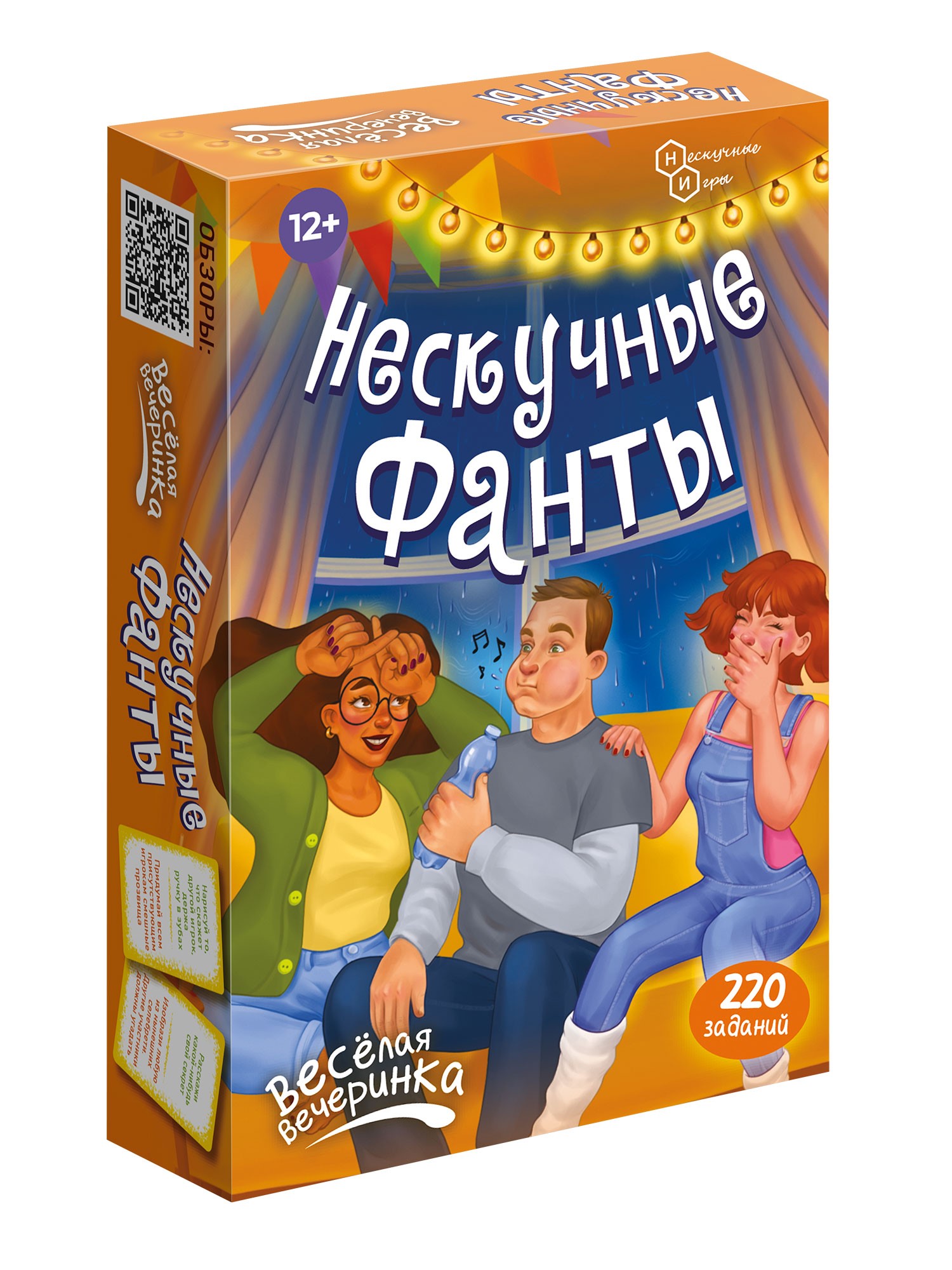 Карточная игра НЕСКУЧНЫЕ ФАНТЫ Весёлая вечеринка - это отличный способ провести время в кругу друзей и новых знакомых. В игре вас ждут 220 увлекательных заданий, которые помогут создать атмосферу радости и веселья. Цель игры: выполнять задания, указанные на карточках. Победителем становится тот, кто выполнит все задания.