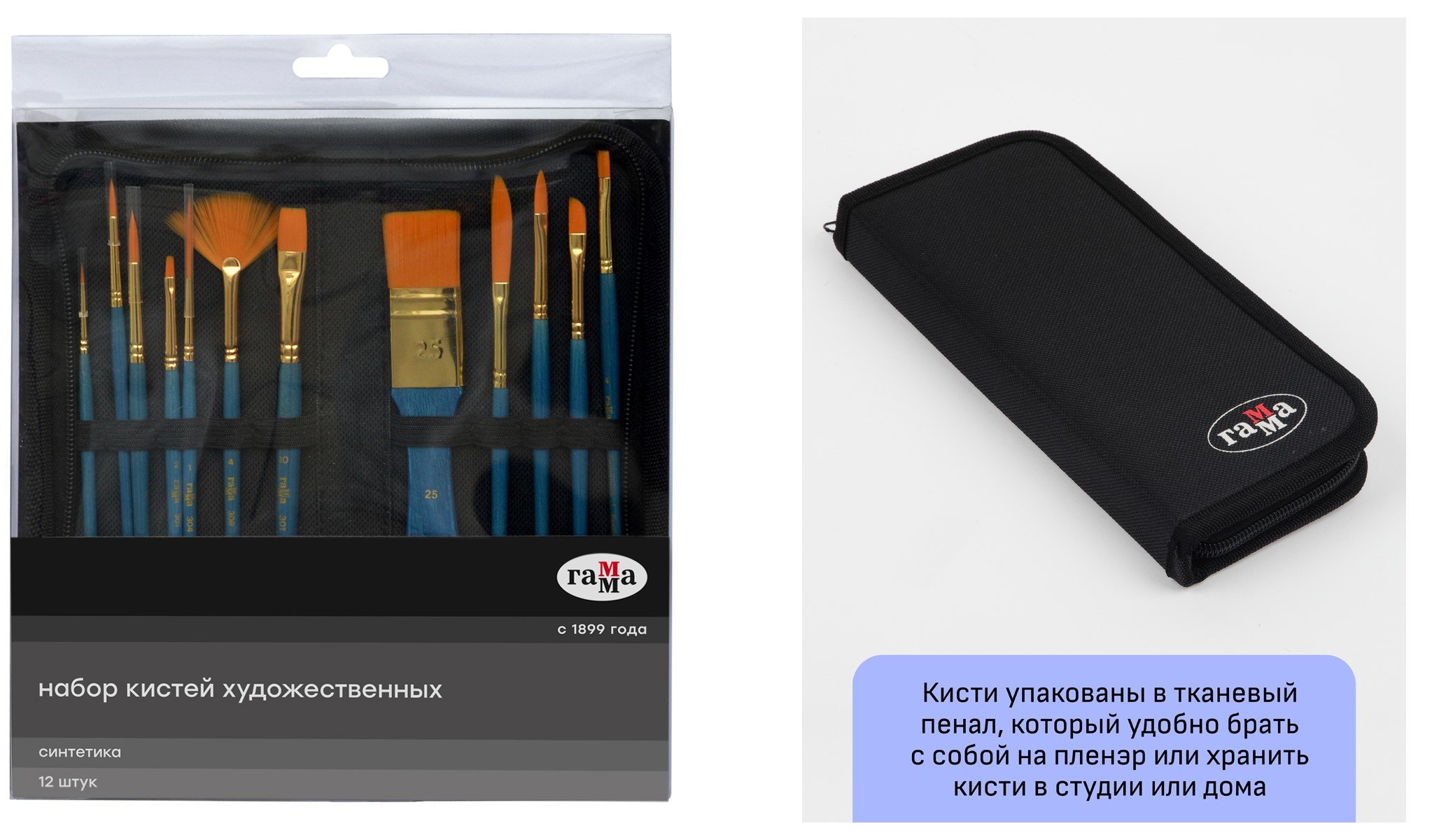 - Художественные кисти 12шт. Синтетика ТМ Гамма, серия "Галерея", тканевый пенал, подвес арт. 3001012