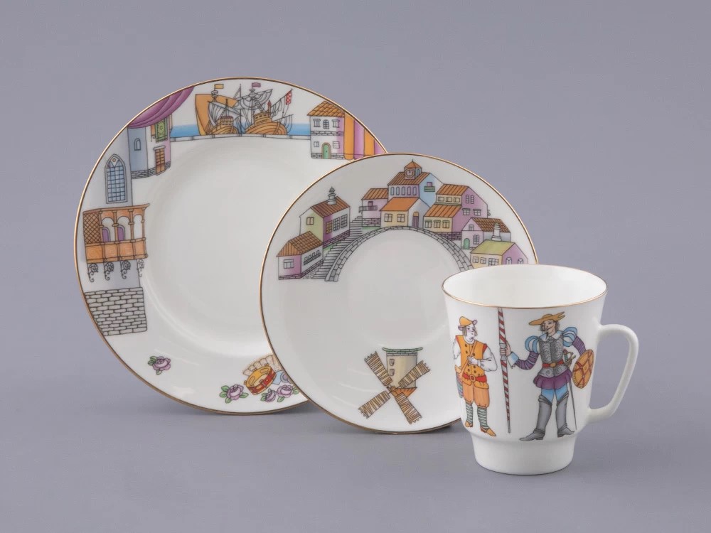 Росписи серии «Русский балет», куда вошел трехпредметный комплект «Дон Кихот», созданы по мотивам самых значительных русских балетных спектаклей. Герои романа Мигеля де Сервантеса, изображенные на фарфоре, отсылают к впечатлениям от спектакля на музыку Людвига Минкуса, где на равных соседствуют жанрово-бытовые сценки, характерная хореография и чистая классика, неизменно очаровывающая щедрой танцевальностью и атмосферой беззаботного праздника, которая отражена на предметах комплекта. «Дон Кихот» – это не только планка виртуозности, но и возможность окунуться в стихию игры, где даже небольшая роль способна расцвести целым букетом юмористических красок. Первое представление спектакля состоялось в 1869 году.