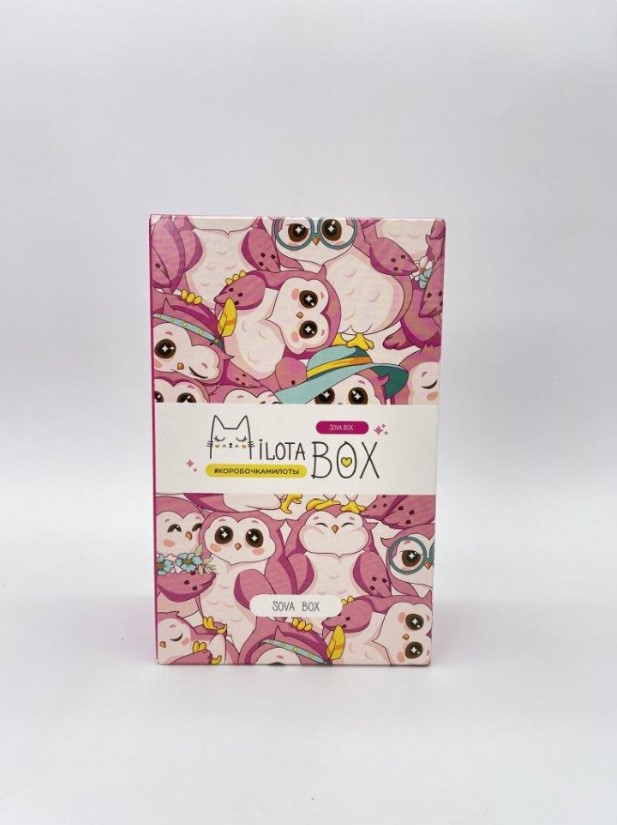mini "Sova Box" Каждая коробочка милоты наполнена необычными вещицами, которыми будет приятно пользоваться в повседневной жизни: милая канцелярия, уютные товары для дома, стильные аксессуары, предметы для здорового образа жизни и приятные мелочи. Внутри Milota BOX находится до 8 сюрпризов, упакованных в стилизованную подарочную бумагу тишью. Коробочка из плотного, дизайнерского картона. Размер коробочки: 22 х 14 х 9 см. Общий вес: 550 гр.