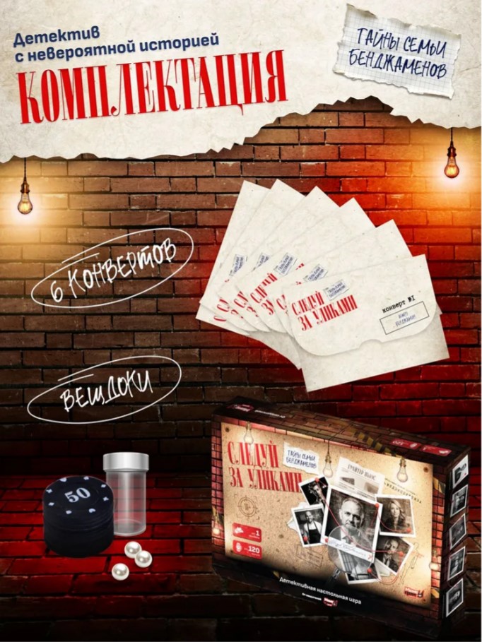 Игра включает 6 конвертов с материалами по делу, которые открываются по мере расследования, что делает её увлекательной и интерактивной. Уникальный сюжет и логические задачи позволят вам почувствовать себя настоящим детективом. 'Следуй за уликами' — это не просто настольная игра, это настоящее приключение для любителей головоломок, детективов и игр для компании.