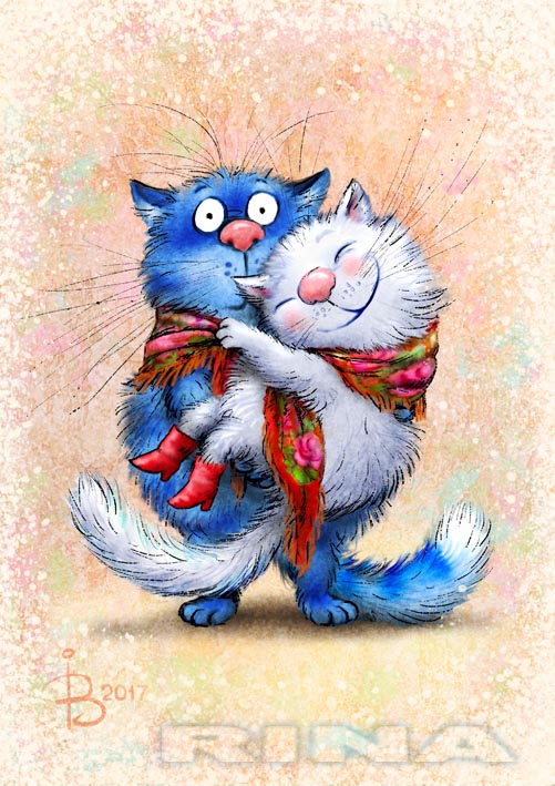 Открытка почтовая из качественного картона, покрытого ламинацией с одной стороны. На открытке изображены влюблённые, синий кот несёт белую кошечку. Кошека в красных сапожках, обвила шею любимого красным платочком. Иллюстрация Ирины Зенюк.