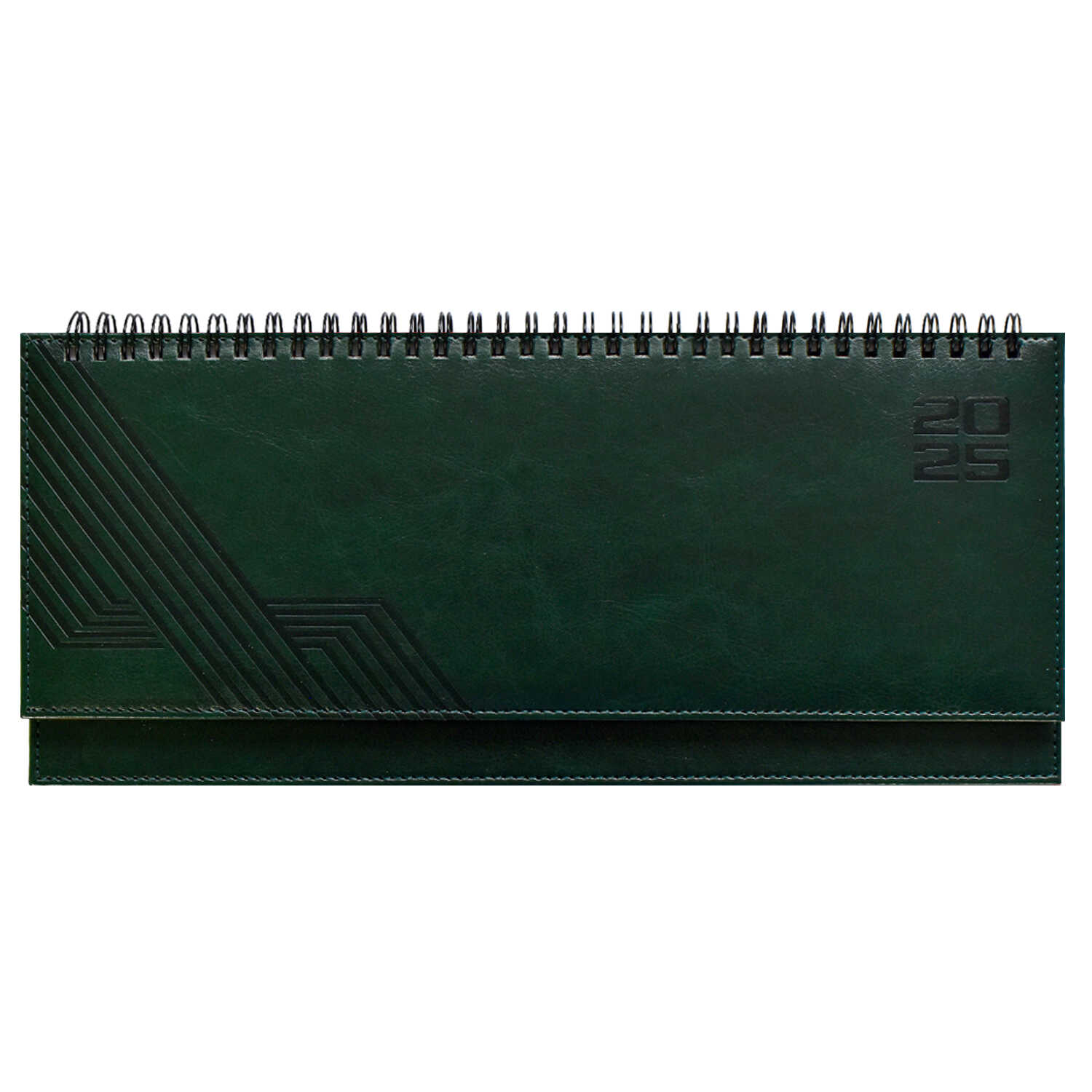 Планинг датированный 2025 ESCALADA, 310x130 мм, 64 л., арт. 67076/ 15 САРИФ ТЁМНО-ЗЕЛЁНЫЙ (кожзам: твёрдый переплёт с поролоном, материал обложки: искусственная кожа "Сариф"; декор: блинтовое тиснение; способ крепления блока: евроспираль открытая; вн. блок: 64 л., белый офсет 70 г/м², печать в две краски (линия), справочный материал: есть; перфорация углов блока: нет; форзац: печать пантоном; персонализация возможна: да; индивидуальная упаковка: ПЭТ-пакет)