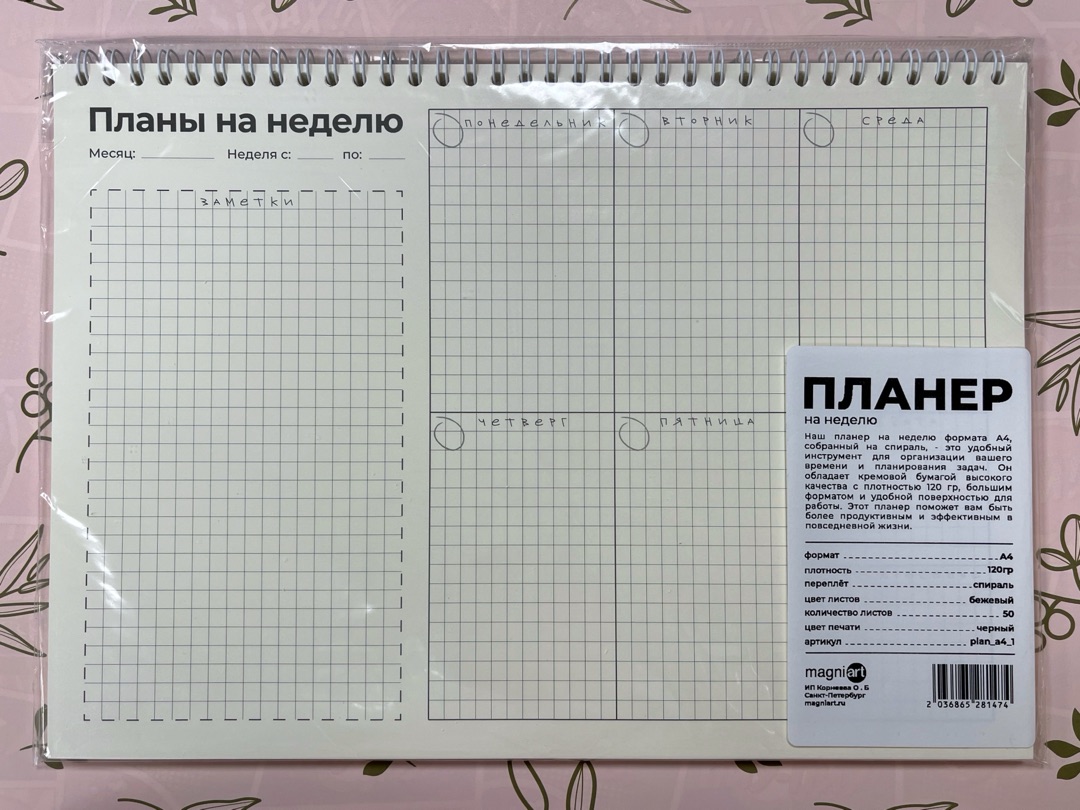 Планер на неделю. Изготовлен из высококачественной кремовой бумаги плотностью 120гр. Планер состоит из 50 листов собранных в белую пружину. Вы можете как отрывать прошедшую неделю, но также можете переворачивать лист. Таким образом вы всегда сможете освежить в памяти информацию о прошлых событиях. Планер можно использовать и как еженедельник. Также есть достаточно места для заметок, чтобы записать расчёты или идеи, которые не хочется вставлять в план на неделю. Планер не датированный. Каждый день и очень удобен в использовании.