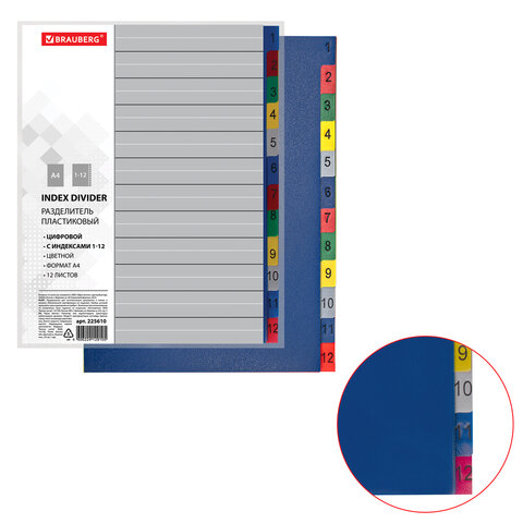 - Разделитель пластиковый BRAUBERG, А4, 12 листов, цифровой 1-12, оглавление, цветной, РОССИЯ 225610/5
