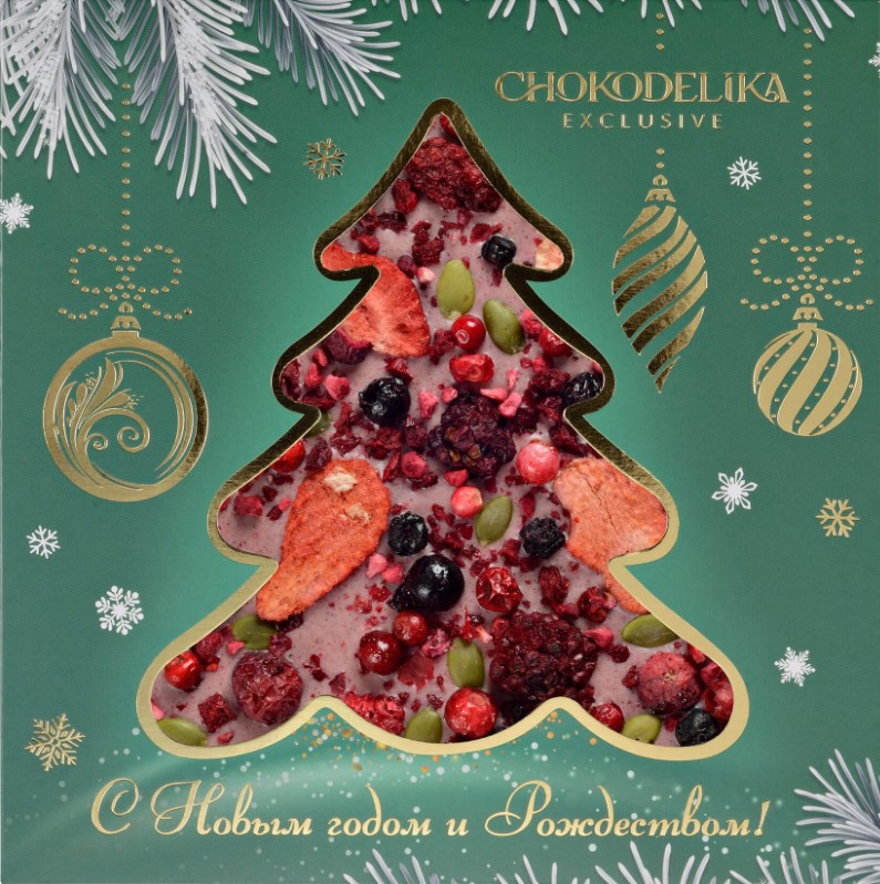 Состав: шоколад белый (сахар, масло какао, цельное сухое молоко, эмульгатор: соевый лецитин, Состав: шоколад белый (сахар, масло какао, цельное сухое молоко, эмульгатор: соевый лецитин, натуральный ароматизатор ванильный), ягоды сушеные (клубника, ежевика, клюква, малина, вишня, черная смородина, черника, брусника), семена тыквы обжаренные, экстракт свеклы сухой. Белая шоколадная масса содержит массовые доли: масла какао – 27,3%, сухого молочного остатка – 22,2%, молочного жира – 6,5%. Массовая доля насыщенных жирных кислот – 21,5%. Массовая доля трансизомеров ненасыщенных жирных кислот – менее 0,5%. Пищевая ценность на 100г продукта: белки – 6,5г; жиры – 30г; углеводы – 57г. Энергетическая ценность на 100г продукта: 530 ккал/ 2190 кДж. Может содержать следы орехов.