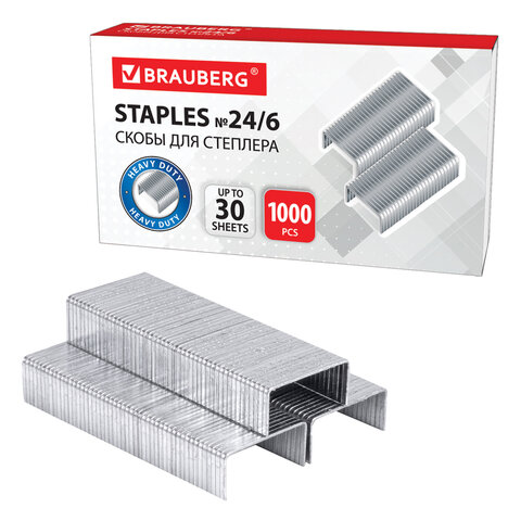 - Скобы для степлера №24/6, 1000 штук, BRAUBERG, до 30 листов, 220950/20