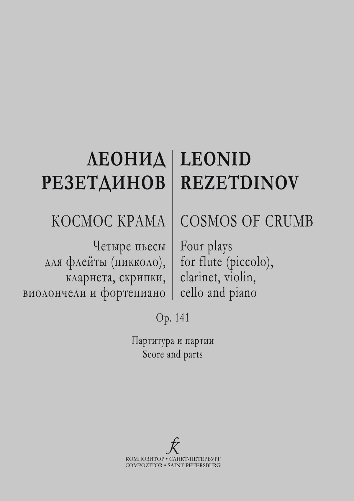 - Космос Крама. Четыре пьесы для флейты, кларнета, скрипки, виолончели и фортепиано. Op. 141. Партитур