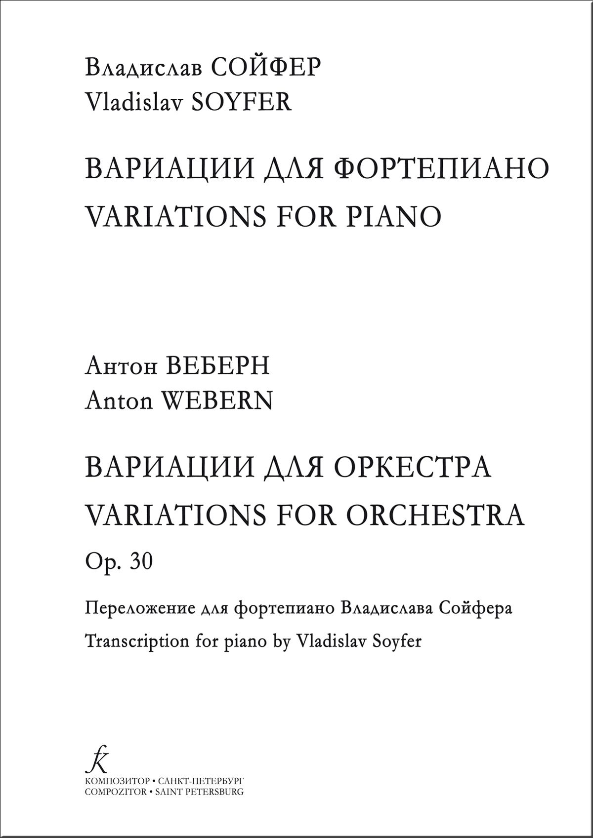 Владислав Сойфер (1961-2021) — композитор, аранжировщик, педагог. Родился на Украине, в Харькове; в детстве жил в Узбекистане, затем переехал в Россию, где и провел большую часть жизни. Обучался композиции в Московской консерватории, где его наставниками были Э. Денисов, Н. Сидельников и другие. Решающими в его формировании как музыканта стали частные занятия с Ф. Гершковичем (учеником А. Веберна и А. Берга); свою музыкальную деятельность Сойфер посвятил продолжению и развитию традиций Новой венской школы. С 2007 года В. Сойфер жил в Коста-Рике, где преподавал композицию, анализ, оркестровку и другие предметы молодым музыкантам и сочинял музыку. В последние годы музыка Владислава Сойфера чаще исполняется и публикуется. В настоящее издание вошли Вариации для фортепиано (2014), а также фортепианное переложение Вариаций для оркестра А. Веберна (соч. 30), сделанное В. Сойфером в последние годы его жизни.